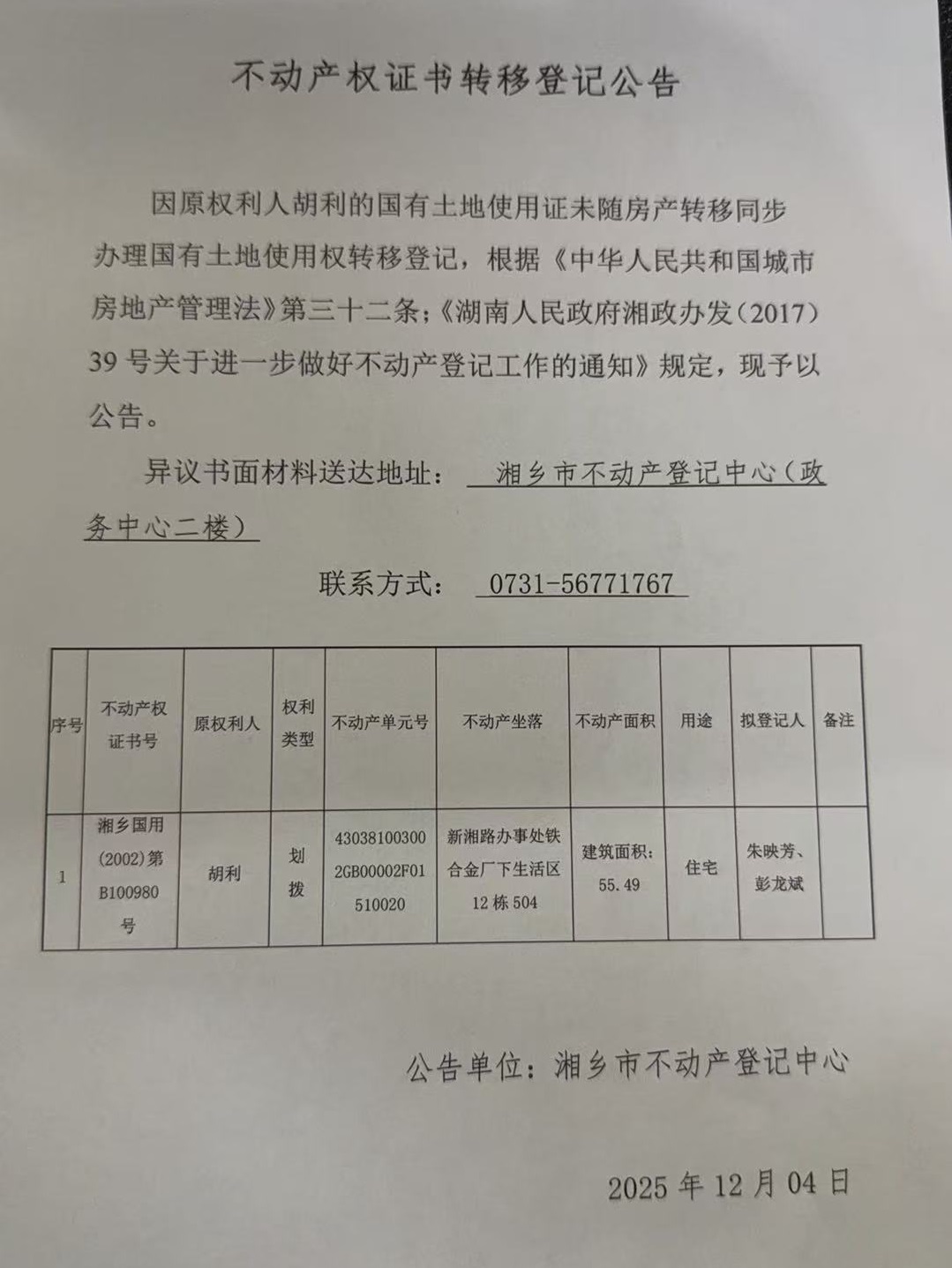 不動(dòng)產(chǎn)權(quán)證書轉(zhuǎn)移登記公告(胡利)