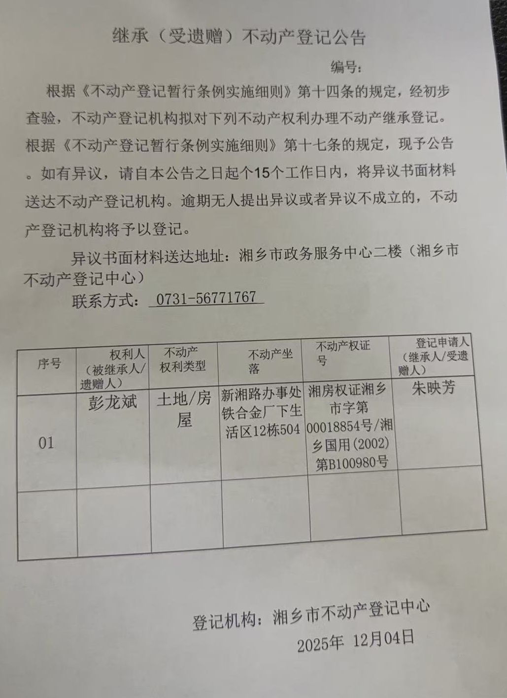 索引號:4303000006/2025-1404855 發布機構:不動產信息公開 發布目錄:不動產登記公告
