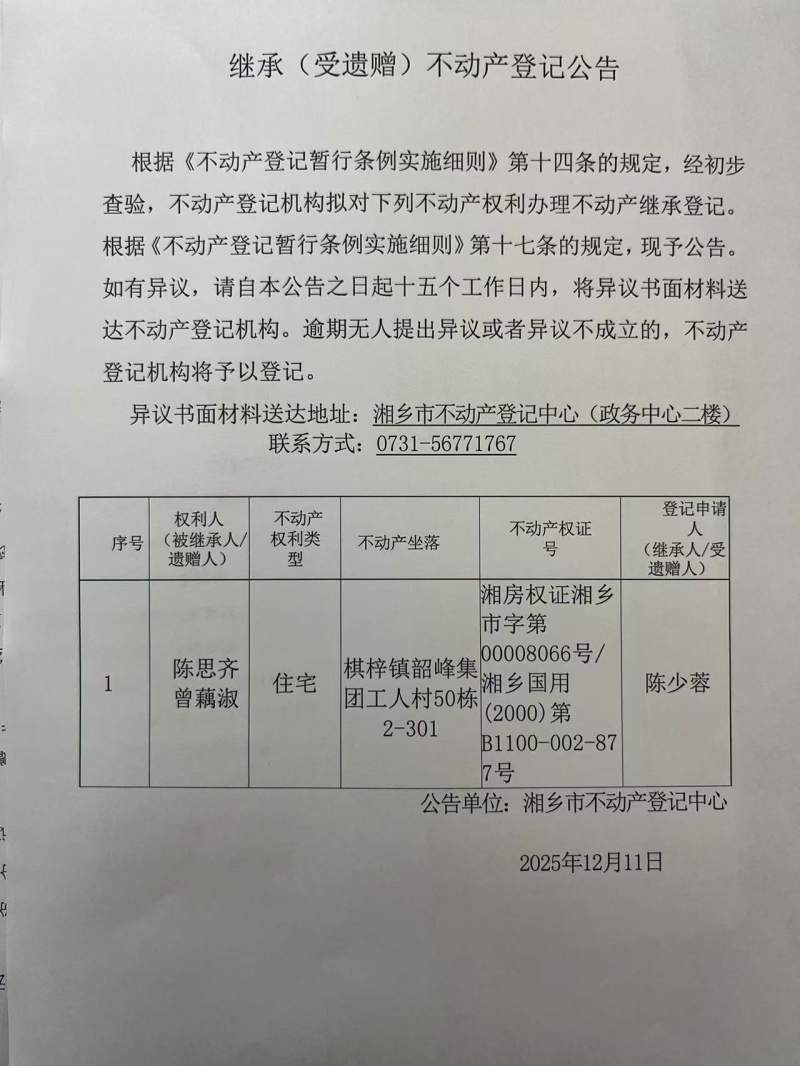 索引號:4303000006/2025-1405826 發布機構:不動產信息公開 發布目錄:不動產登記公告