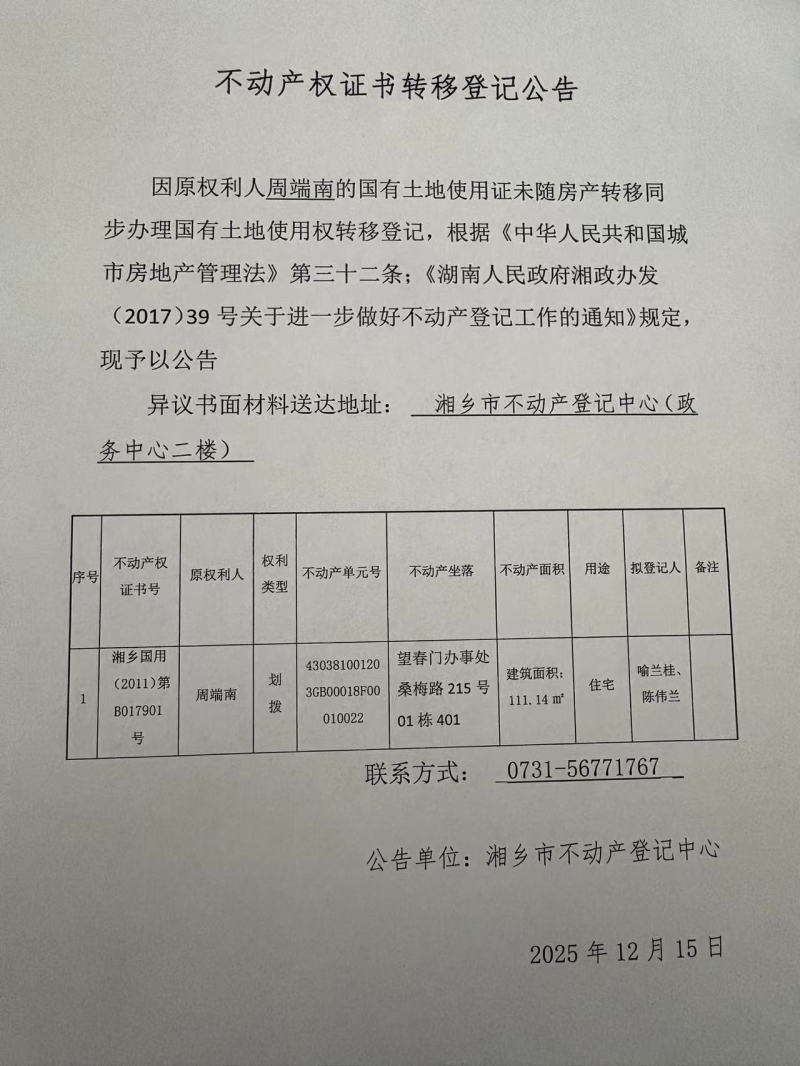 周端南(不動(dòng)產(chǎn)轉(zhuǎn)移公告)