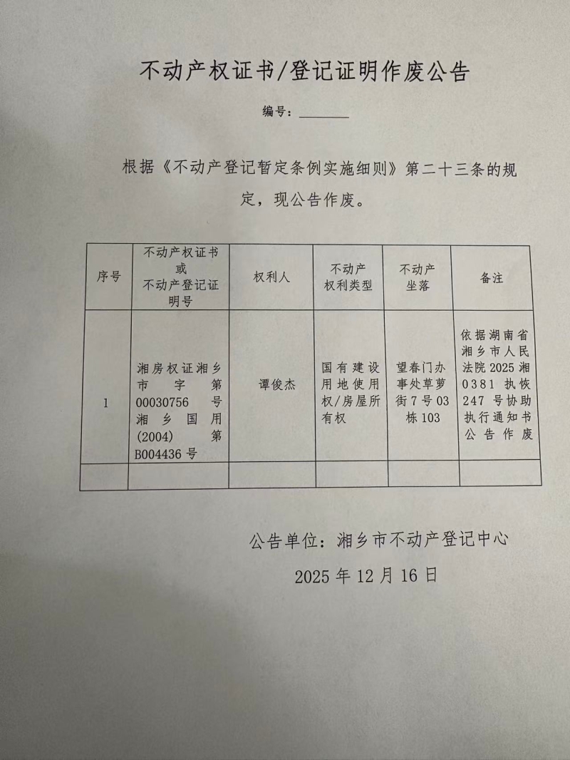 索引號:4303000006/2025-1406405 發布機構:不動產信息公開 發布目錄:不動產登記公告