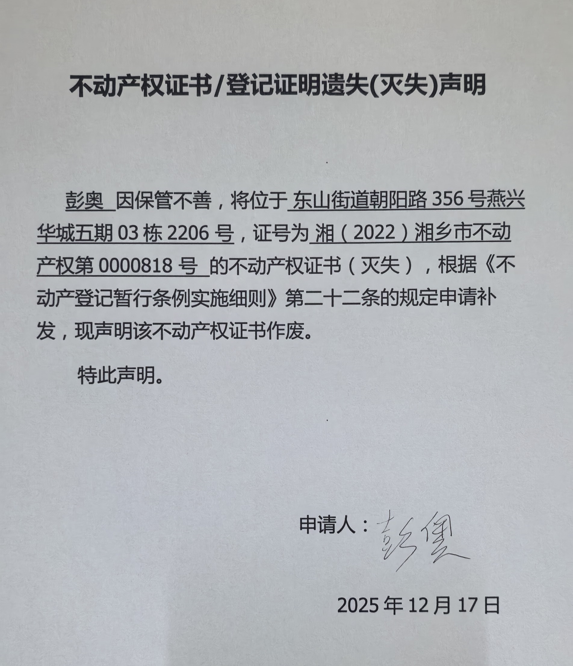不動產補發證登記(彭奧)