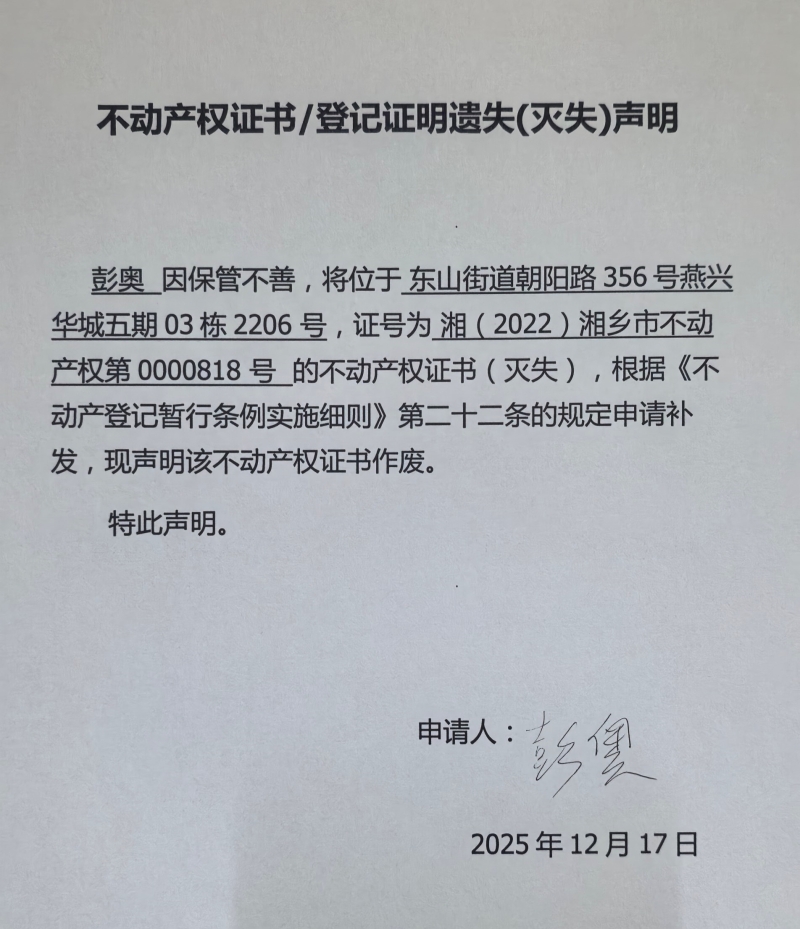 索引號:4303000006/2025-1406622 發布機構:不動產信息公開 發布目錄:不動產登記公告