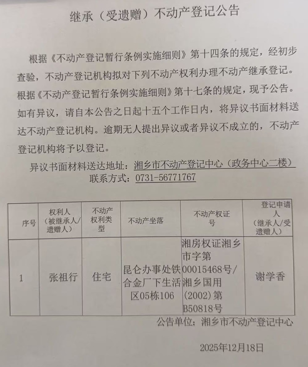 索引號:4303000006/2025-1406703 發布機構:不動產信息公開 發布目錄:不動產登記公告