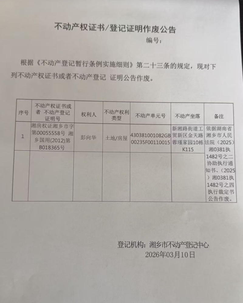 索引號:4303000006/2026-1421497 發(fā)布機(jī)構(gòu):不動產(chǎn)信息公開 發(fā)布目錄:不動產(chǎn)登記公告