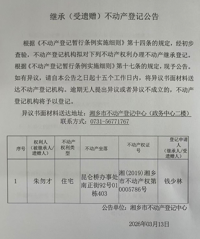 索引號:4303000006/2026-1422278 發(fā)布機構(gòu):不動產(chǎn)信息公開 發(fā)布目錄:不動產(chǎn)登記公告