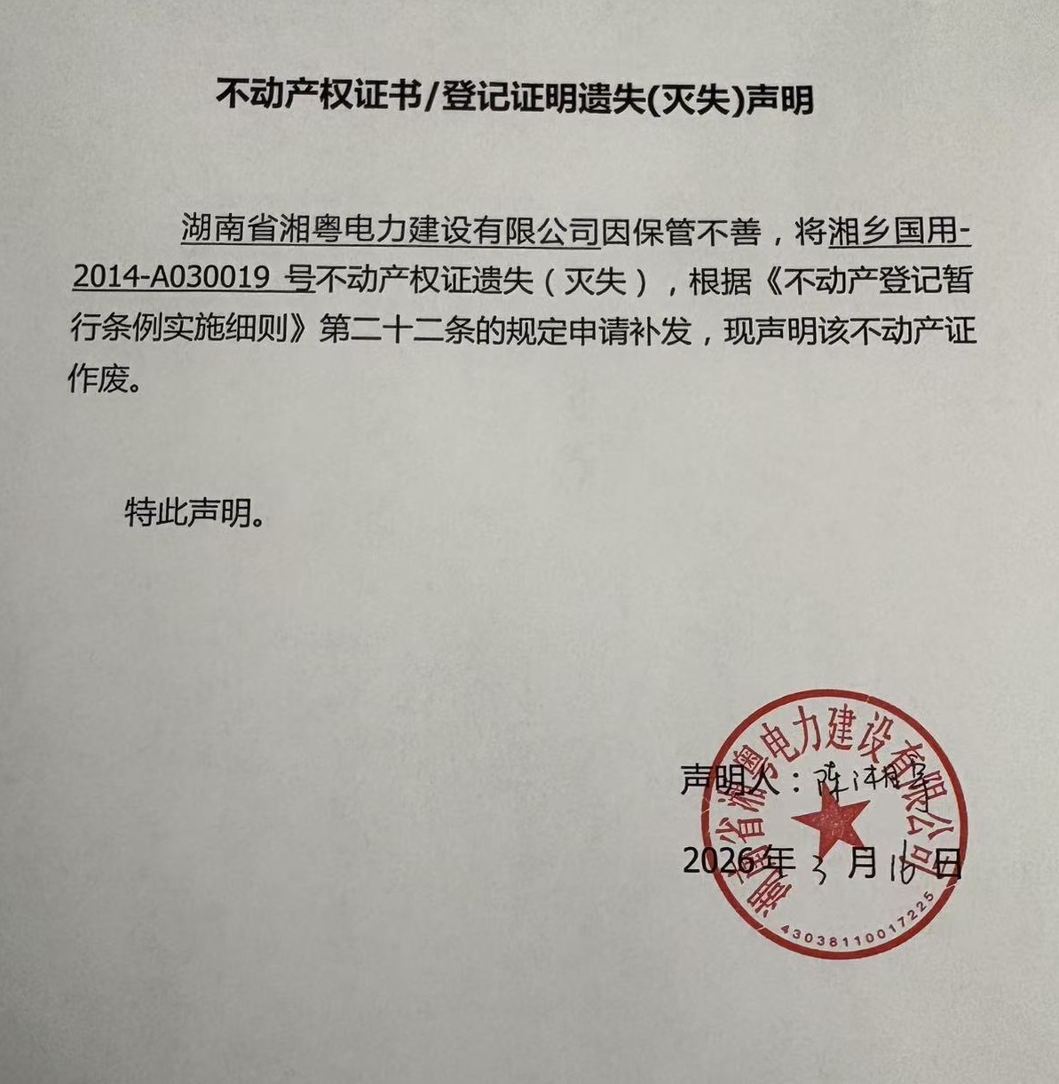 湖南省湘粵電力建設(shè)有限公司(不動產(chǎn)遺失聲明)