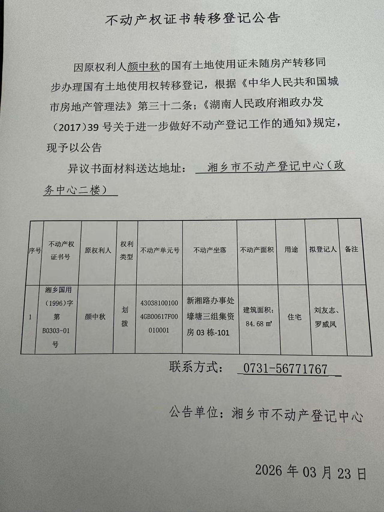 索引號:4303000006/2026-1423189 發布機構:不動產信息公開 發布目錄:不動產登記公告