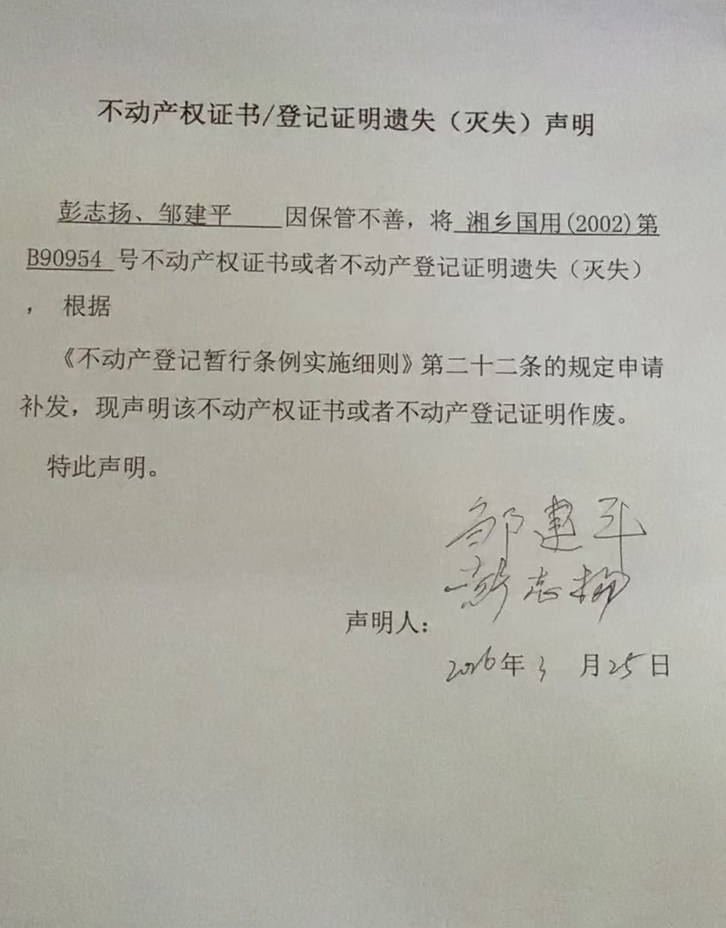 不動產權證書遺失聲明(彭志揚、鄒建平)