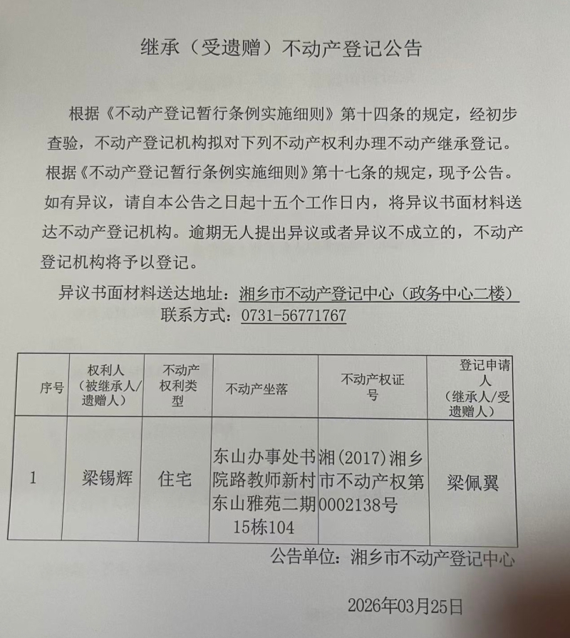 索引號:4303000006/2026-1423811 發布機構:不動產信息公開 發布目錄:不動產登記公告