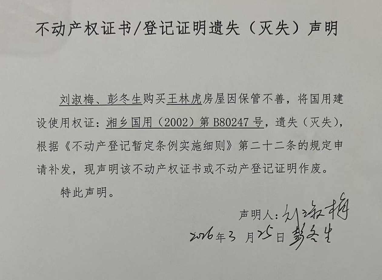 劉淑梅、彭冬生(不動產(chǎn)遺失聲明)