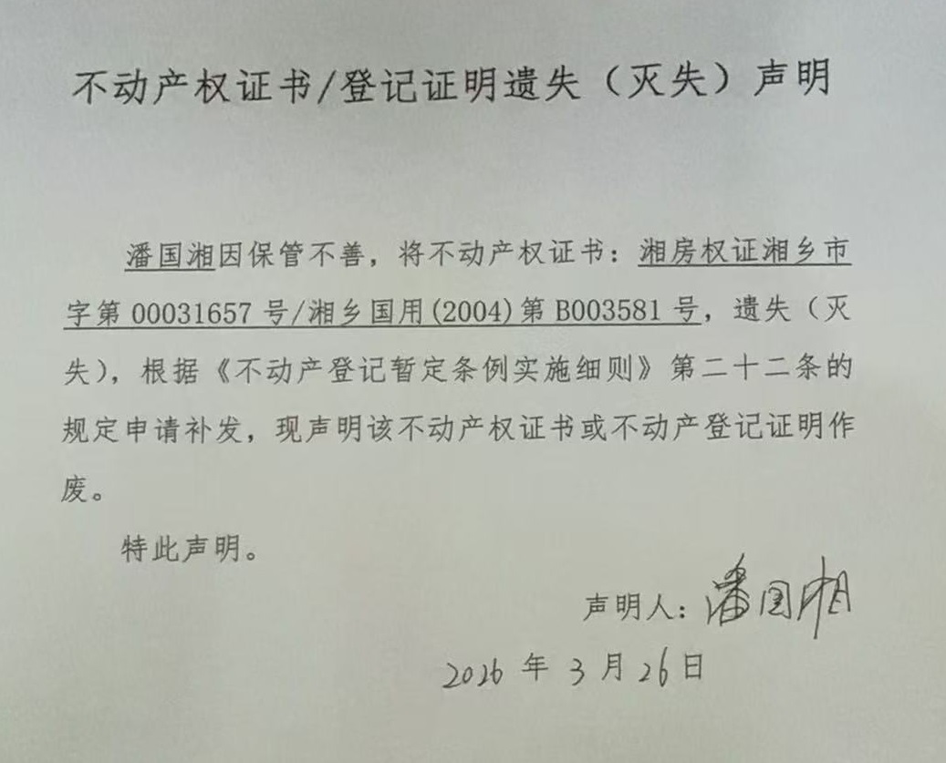 索引號:4303000006/2026-1423921 發布機構:不動產信息公開 發布目錄:不動產登記公告