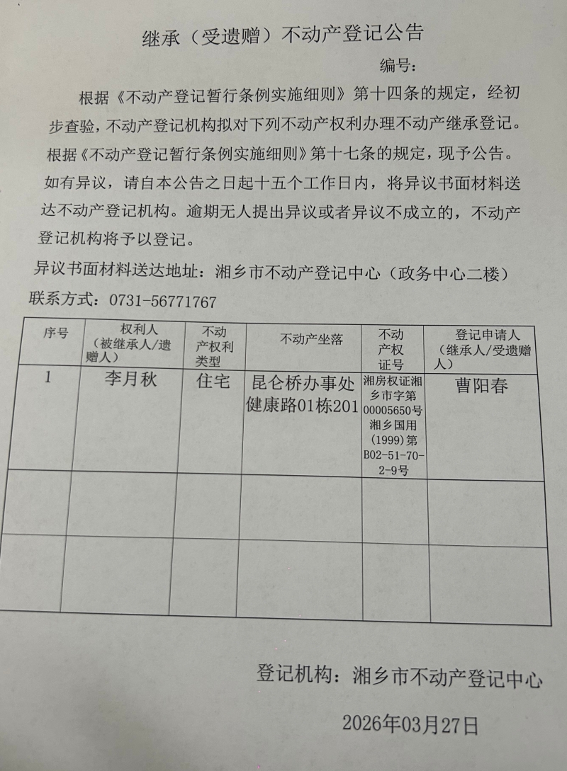 索引號:4303000006/2026-1424091 發布機構:不動產信息公開 發布目錄:不動產登記公告