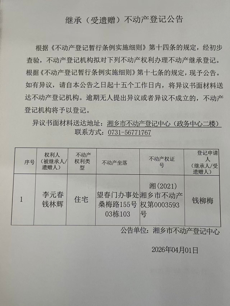 不動(dòng)產(chǎn)繼承公告(李元春 錢(qián)林輝)