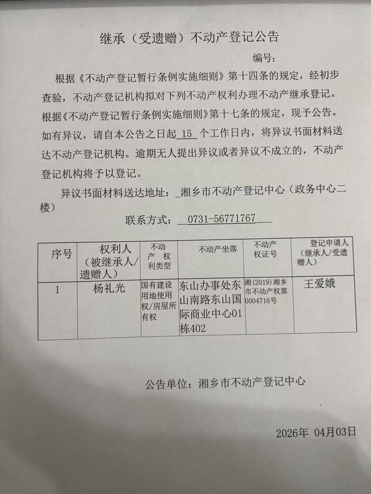索引號:4303000006/2026-1425278 發布機構:不動產信息公開 發布目錄:不動產登記公告