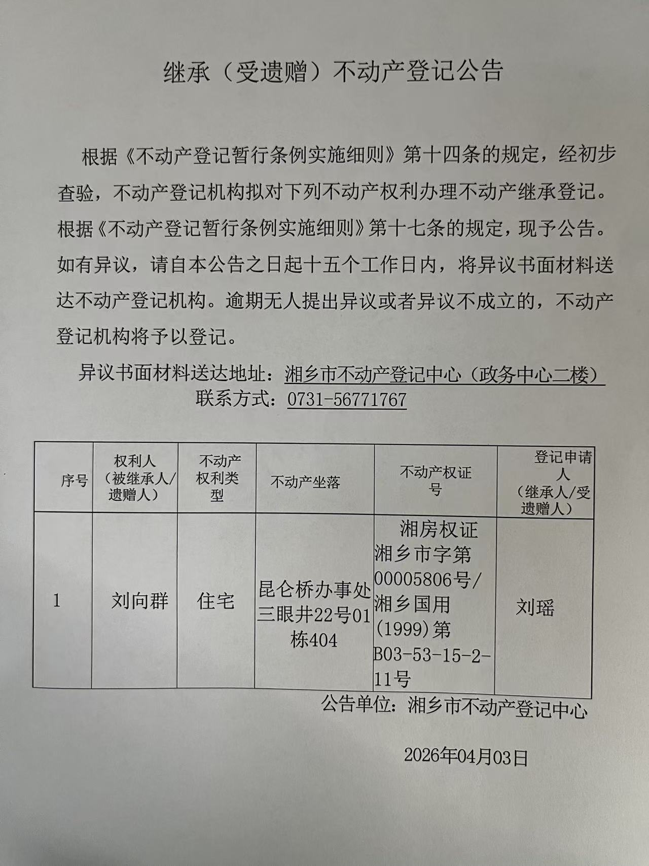 繼承不動(dòng)產(chǎn)登記公告(劉向群)