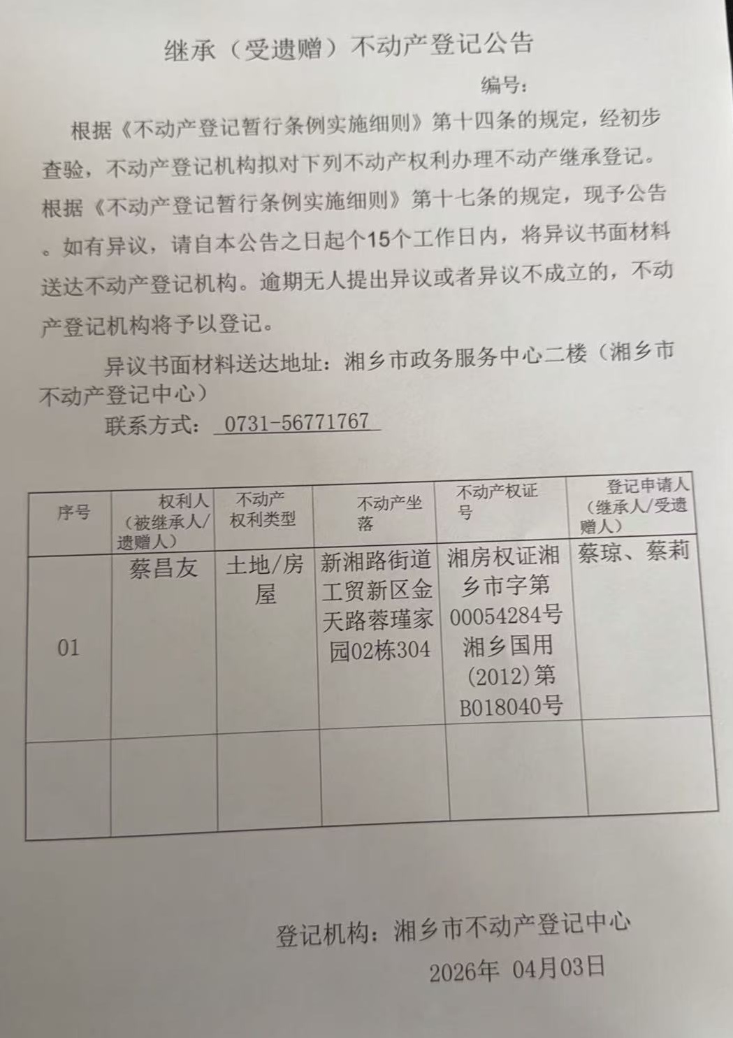 索引號:4303000006/2026-1425291 發布機構:不動產信息公開 發布目錄:不動產登記公告