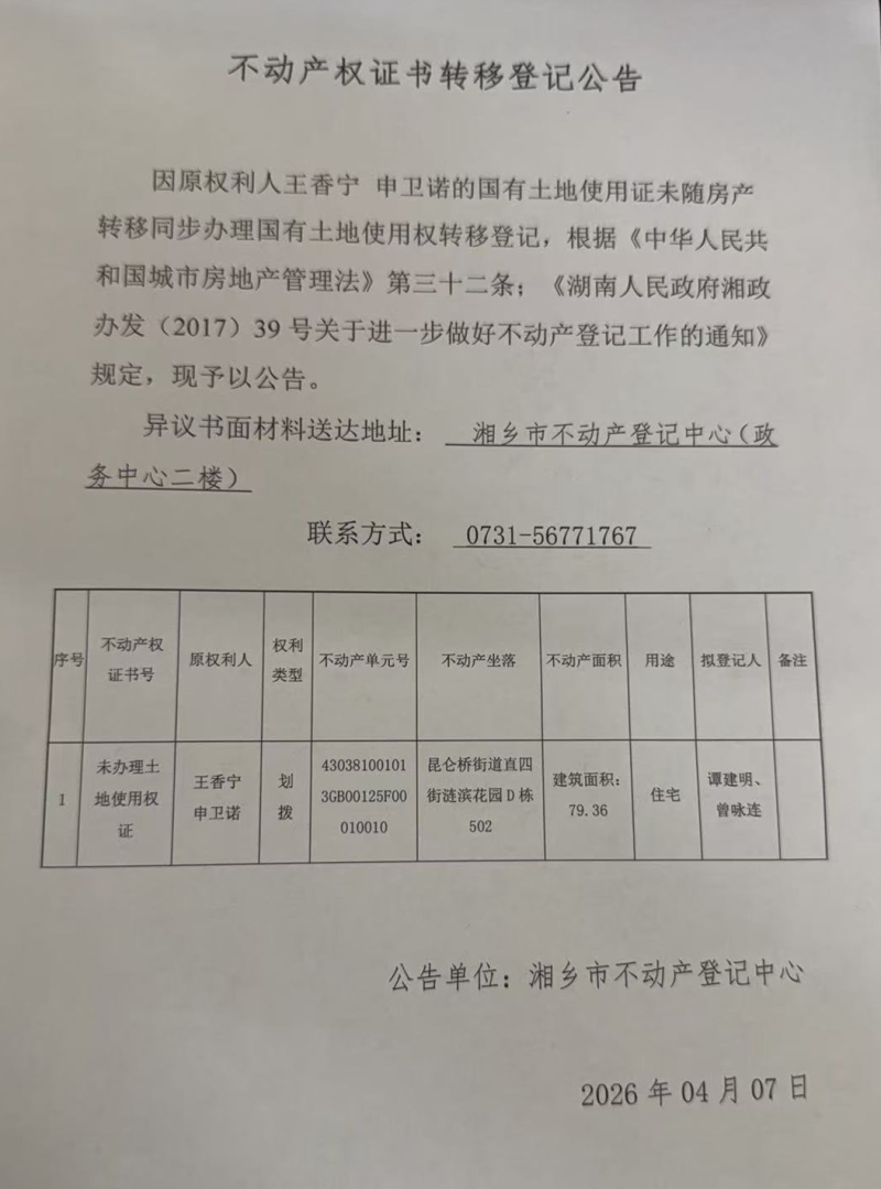 索引號:4303000006/2026-1425418 發布機構:不動產信息公開 發布目錄:不動產登記公告