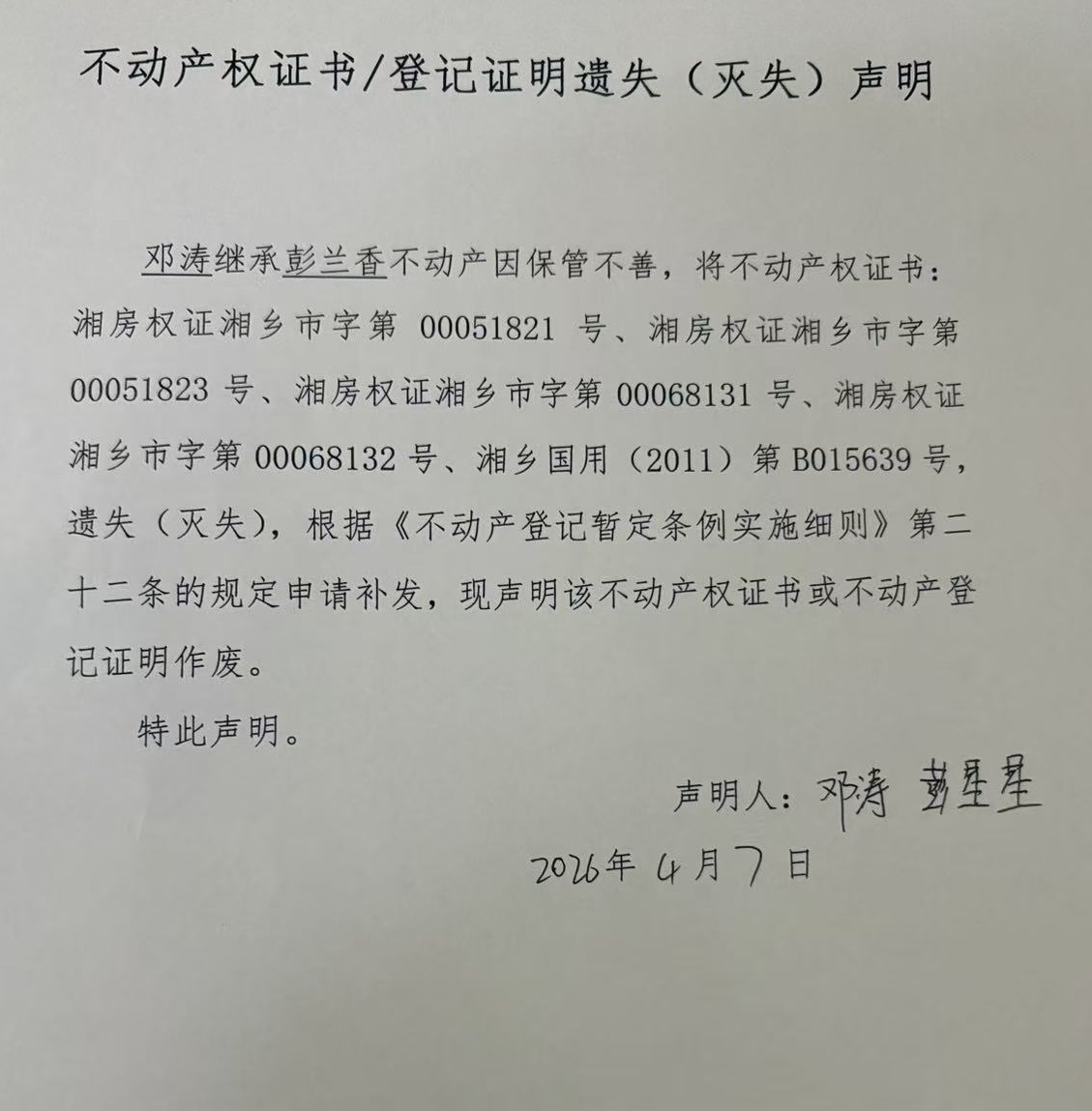 鄧濤(不動產遺失聲明)