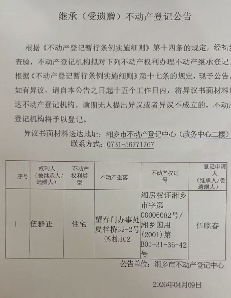 索引號:4303000006/2026-1425935 發布機構:不動產信息公開 發布目錄:不動產登記公告