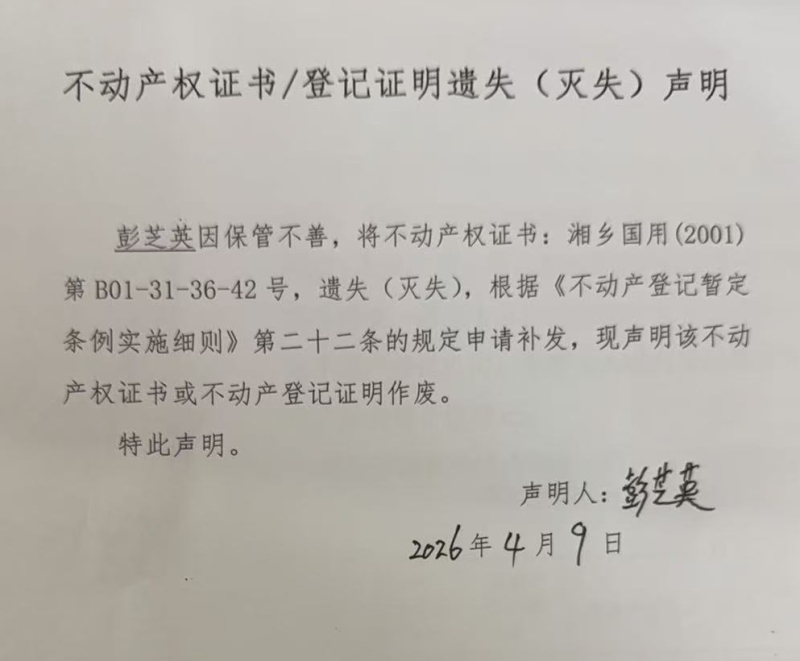 索引號:4303000006/2026-1425936 發布機構:不動產信息公開 發布目錄:不動產登記公告