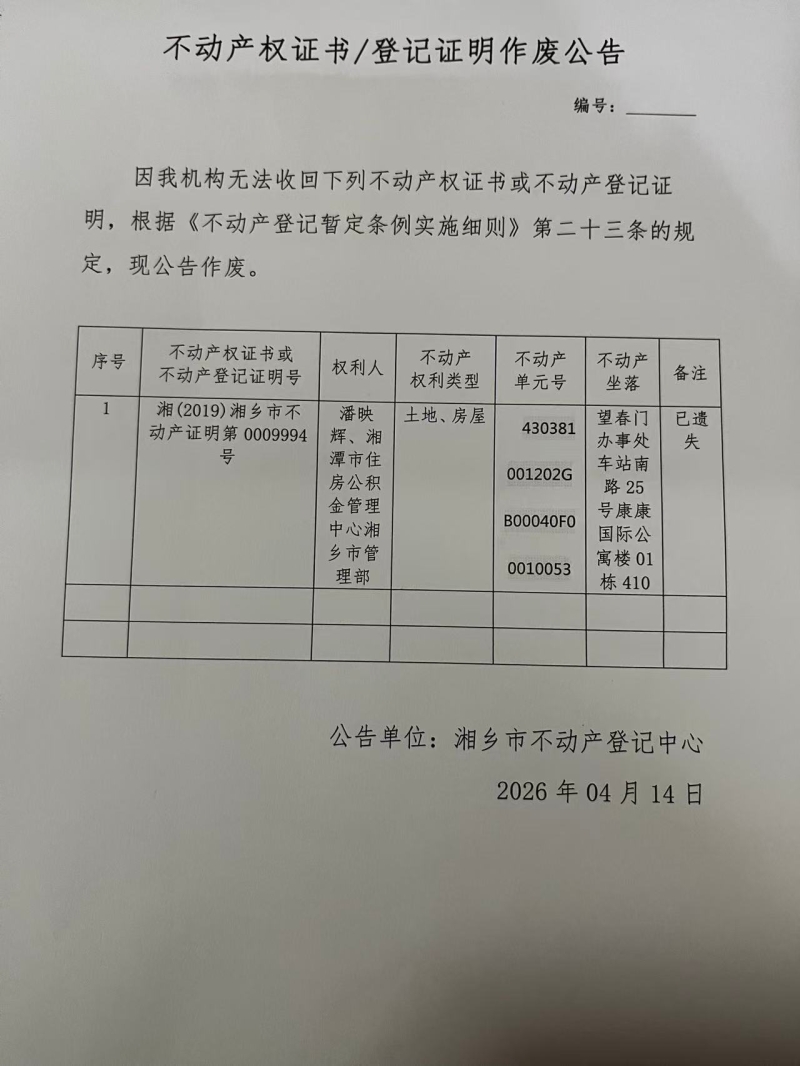 不動產(chǎn)權(quán)證書作廢公告(湘潭市住房公積金管理中心湘鄉(xiāng)市管理部)