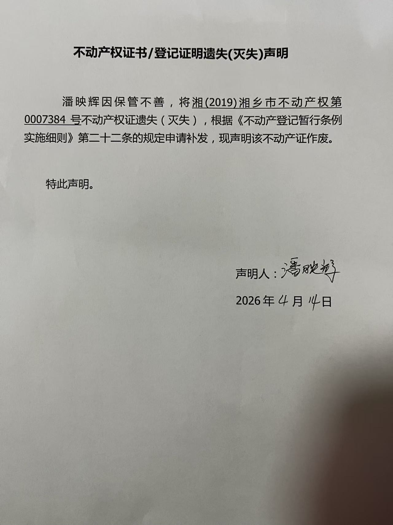 不動產權證書遺失聲明(潘映輝)