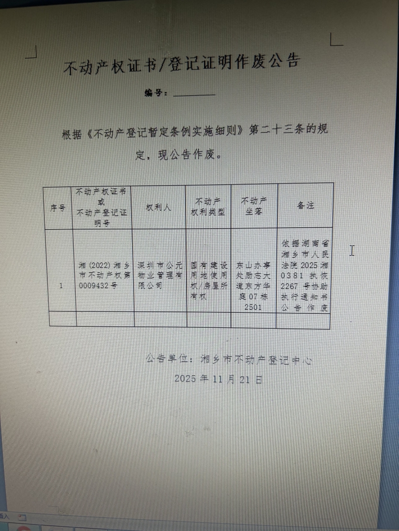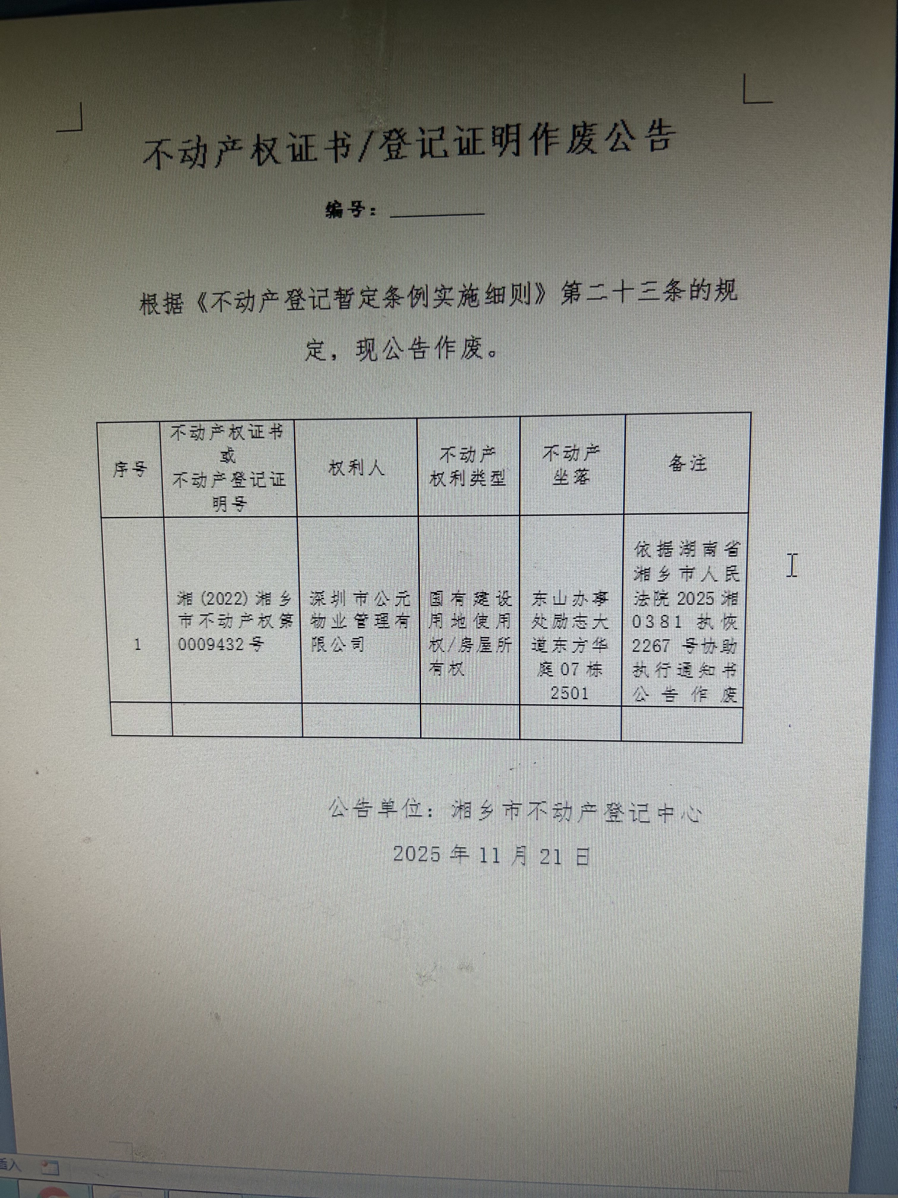 不動(dòng)產(chǎn)作廢公告(深圳市公元物業(yè)管理有限公司)