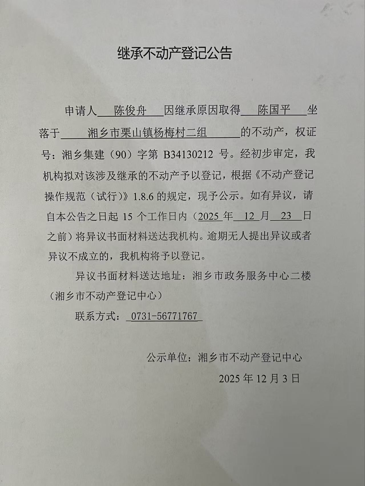 繼承不動產(chǎn)登記公告(陳國平)