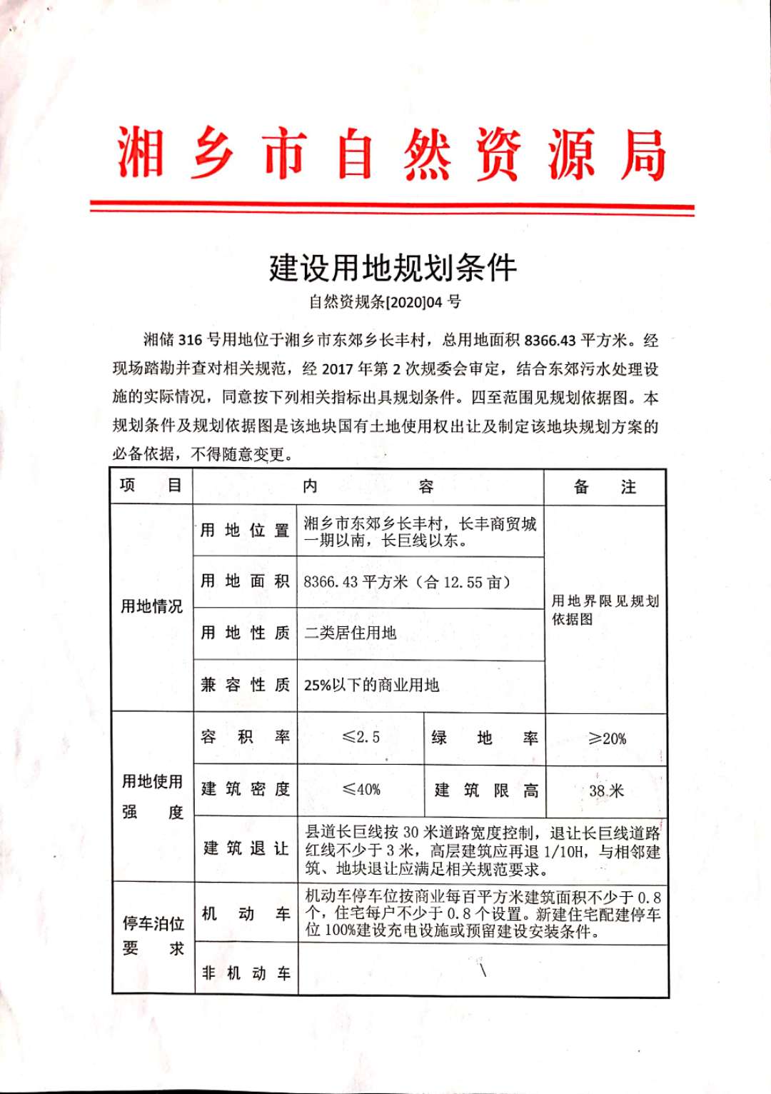 | 潭鄉公土網掛(2020)010號 | 湘鄉市東郊鄉長豐村、長豐商貿城一期以南、長巨線以東 | 8366.43 | 現狀 | 商住(兼容25%以下商業用地) | 住宅70年、商業40年 | ≤2.5 | ≤40% | ≥20% | 753 | 753 |