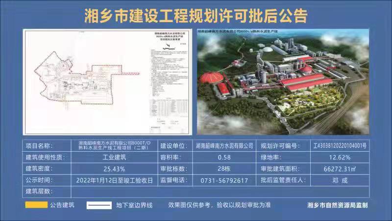 湖南韶峰南方水泥有限公司8000T/D熟料水泥生產(chǎn)線項目(二期)規(guī)劃許可批后公告