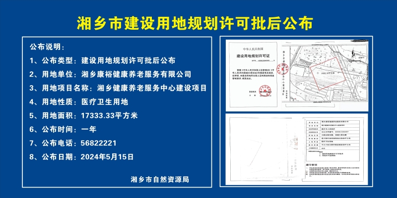 湘鄉(xiāng)健康養(yǎng)老服務(wù)中心建設(shè)項目建設(shè)用地規(guī)劃許可批后公布