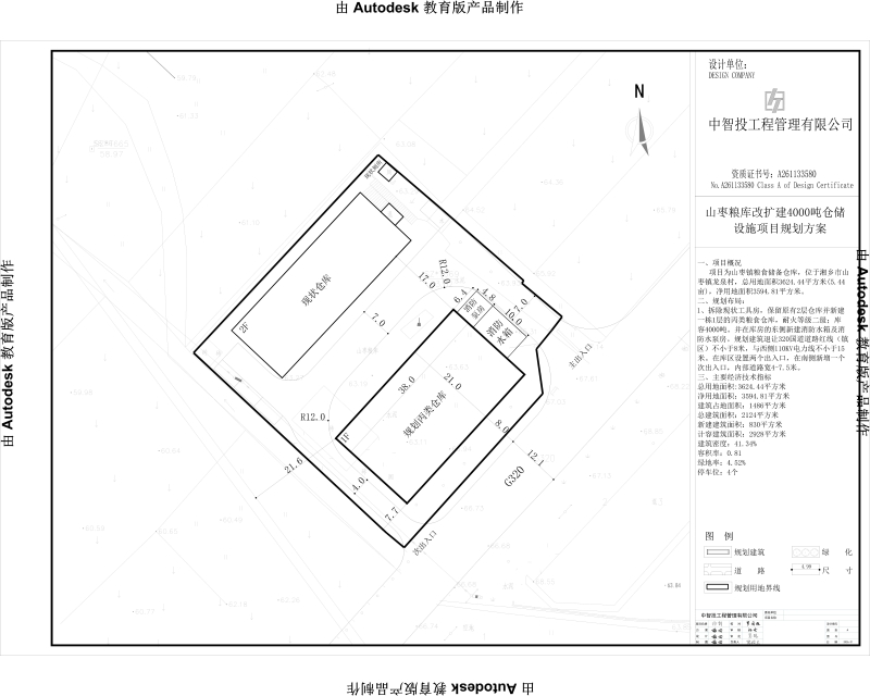 二、規劃布局:拆除現狀工具房,新建一棟1層的丙類糧食倉庫。在庫房的東側新建消防水箱及消防水泵房;建筑退讓320國道道路紅線(鎮區)不小于8米,與西側110KV電力線不小于15米;設置兩個出入口,在南側新增一個次出入口,內部道路寬4.0-7.0米。