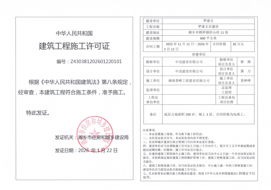 索引號:4303000006/2026-1414901 發布機構:行政執法 發布目錄:建筑工程施工許可