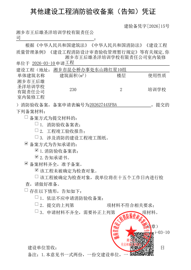 湘鄉(xiāng)市王后雄圣洋培訓(xùn)學(xué)校有限責(zé)任公司室內(nèi)裝修工程消防驗收備案