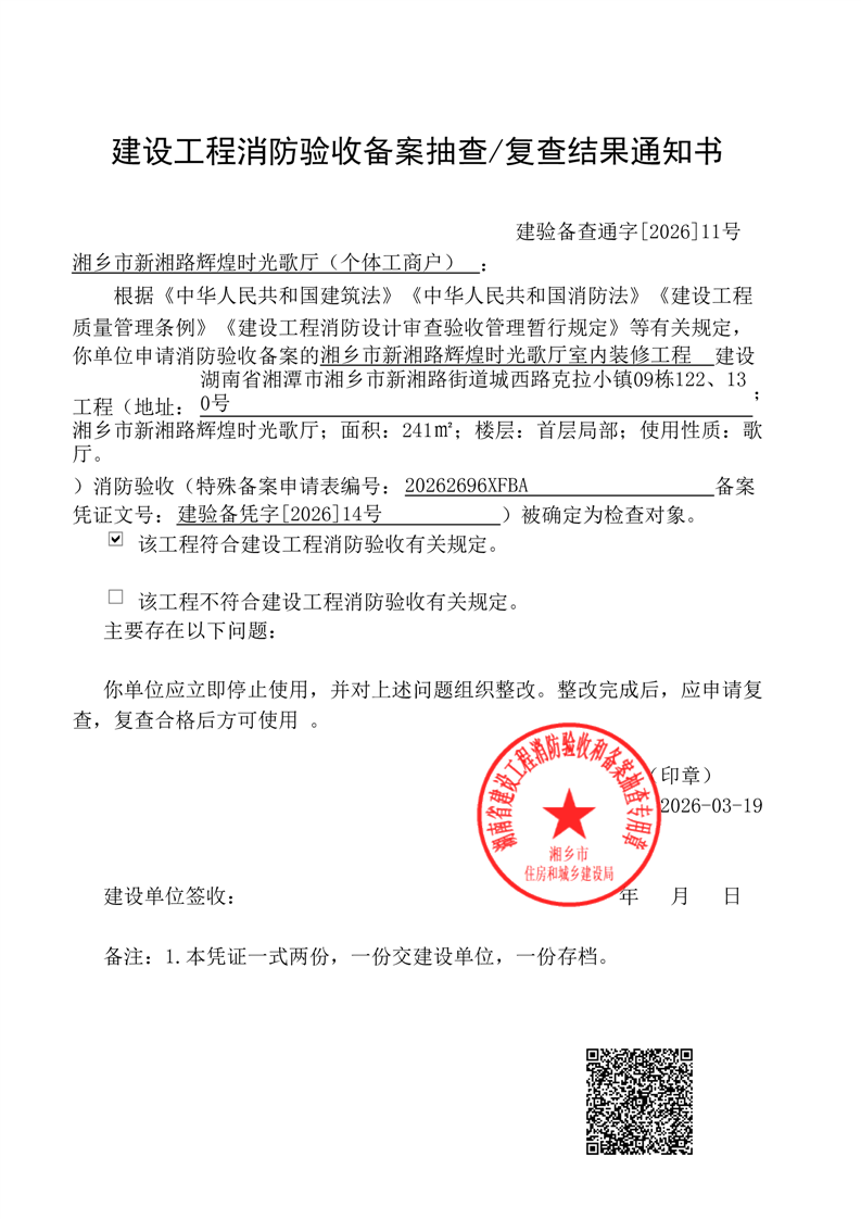 湘鄉(xiāng)市新湘路輝煌時光歌廳室內(nèi)裝修工程消防驗收備案抽(復(fù))查通知書