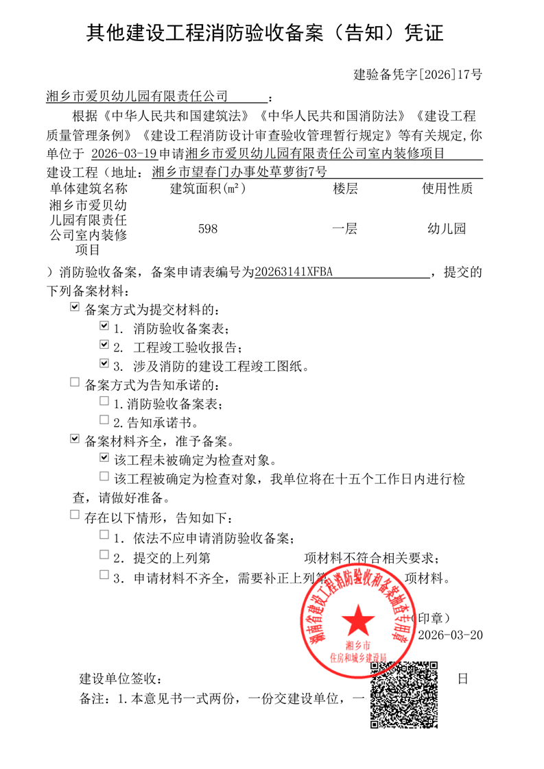 湘鄉市愛貝幼兒園有限責任公司室內裝修項目消防驗收備案憑證