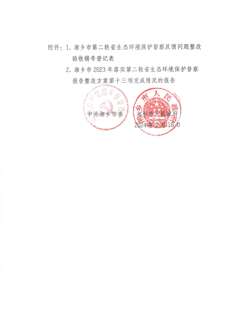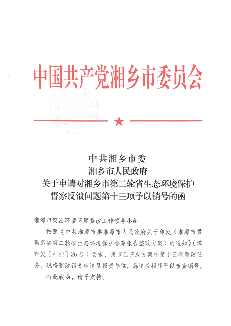 關于申請對湘鄉(xiāng)市第二輪省生態(tài)環(huán)境保護督察反饋問題第十三項予以銷號的函