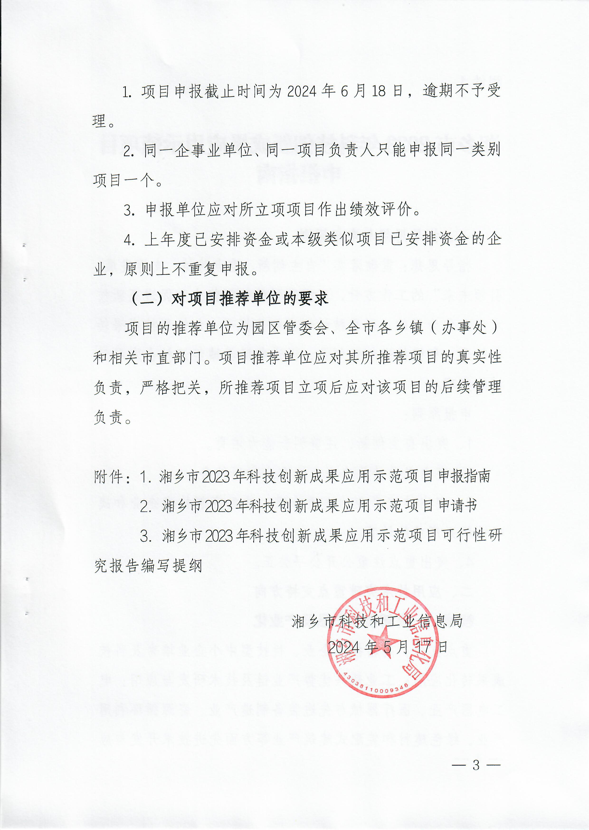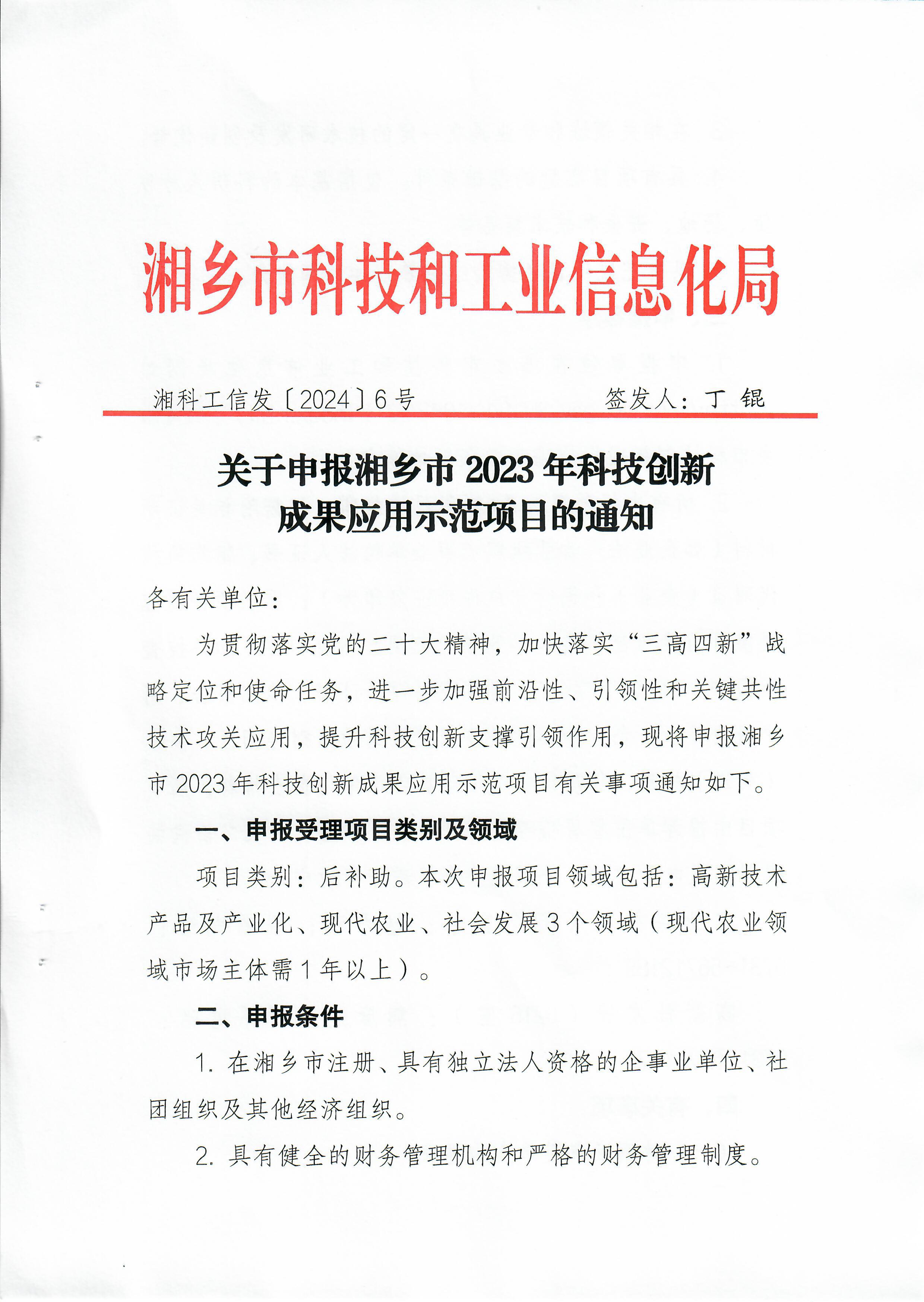 關于申報湘鄉市2023年科技創新 成果應用示范項目的通知