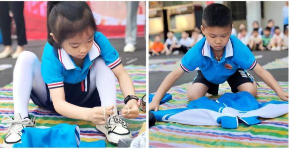 一年級(jí)進(jìn)行的是系鞋帶、疊校服、整理書(shū)包比賽。隨著老師的一聲令下,選手們迅速地把衣服疊整齊。聽(tīng)到系鞋帶的口令,選手們爭(zhēng)分奪秒將腳穿進(jìn)鞋子里,細(xì)長(zhǎng)的鞋帶在學(xué)生們靈活的手指間來(lái)回飛舞,一朵朵漂亮的“蝴蝶花”爭(zhēng)相盛開(kāi)。書(shū)包按照書(shū)籍、本子、文具分類整理好。