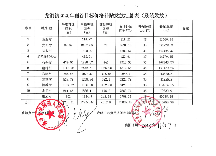 龍洞鎮2025年稻谷目標價格補貼發放匯總表(系統發放)