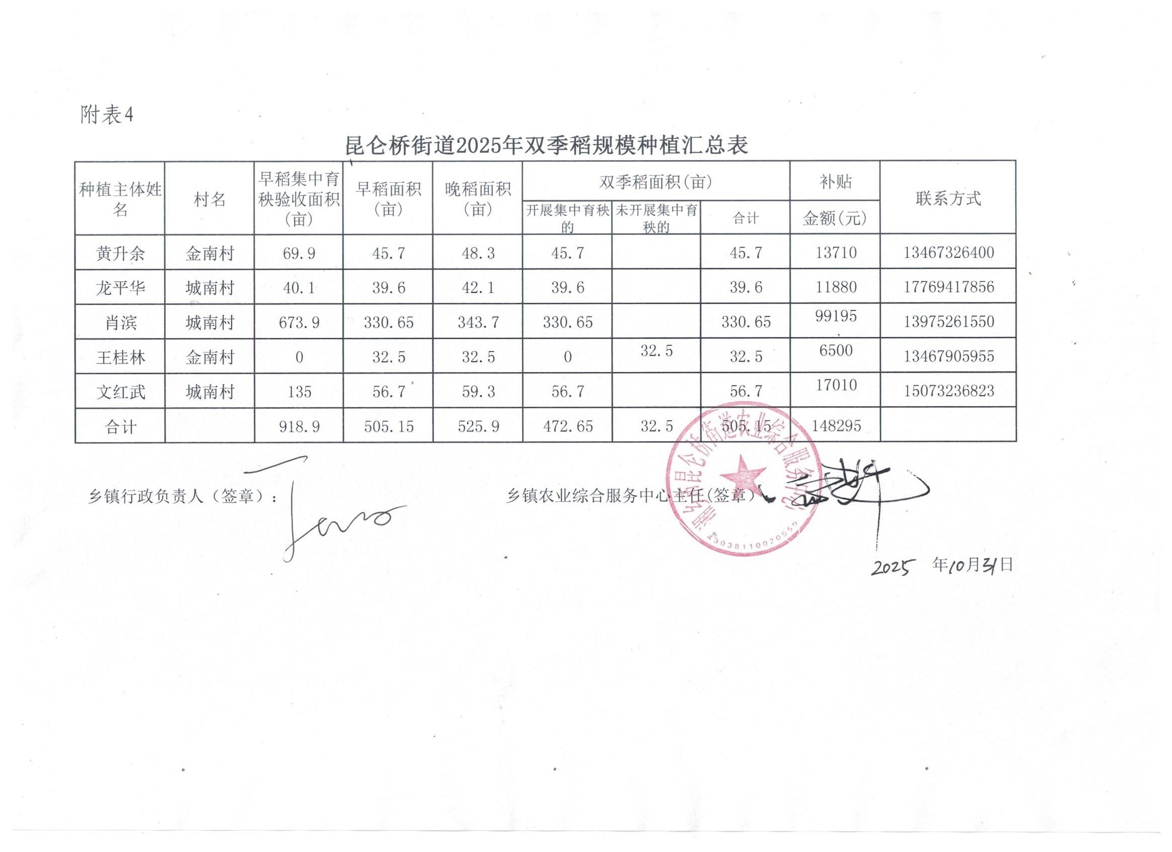 昆侖橋街道2025年雙季稻規模種植匯總表