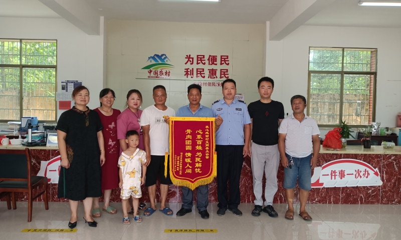 1日,東郊鄉柘塘村一村民全家將一面印有“骨肉團員,情暖人間,心系百姓,為民解憂”的錦旗送到柘塘村村部,對柘塘村支村兩委、駐村輔警幫助找到失散14年之久的親人表示感謝。
