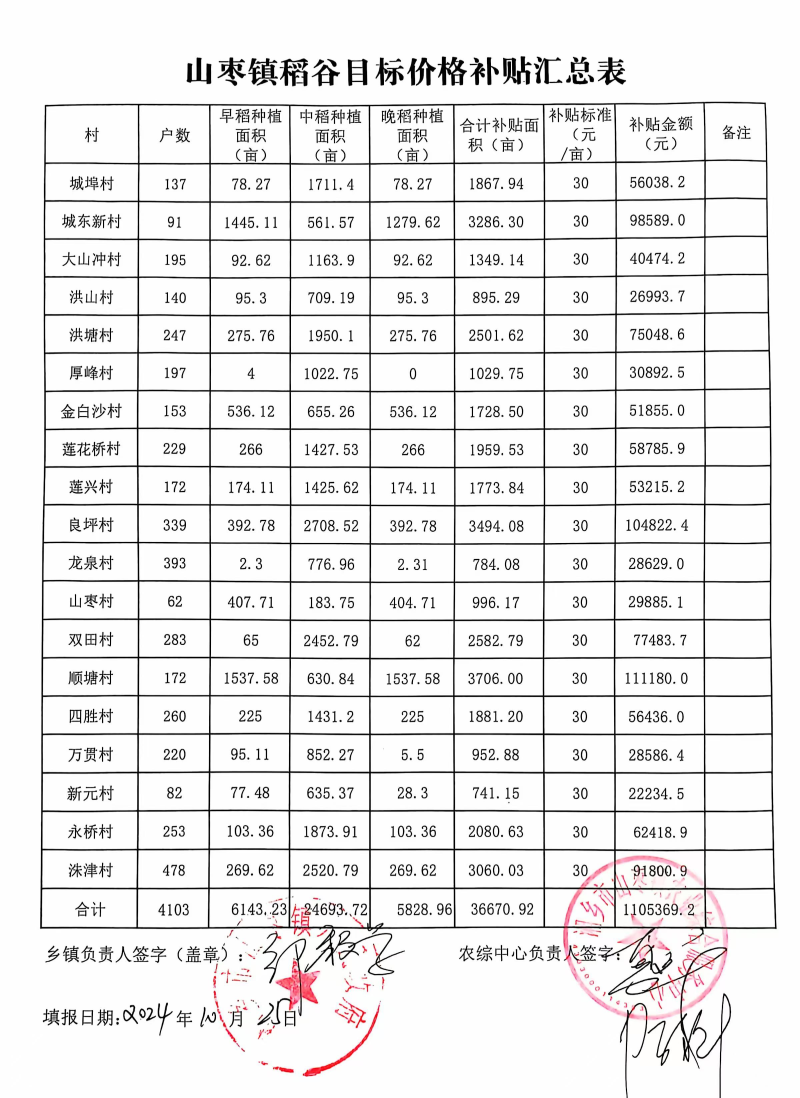 山棗鎮(zhèn)2024年稻谷目標價格補貼匯總表