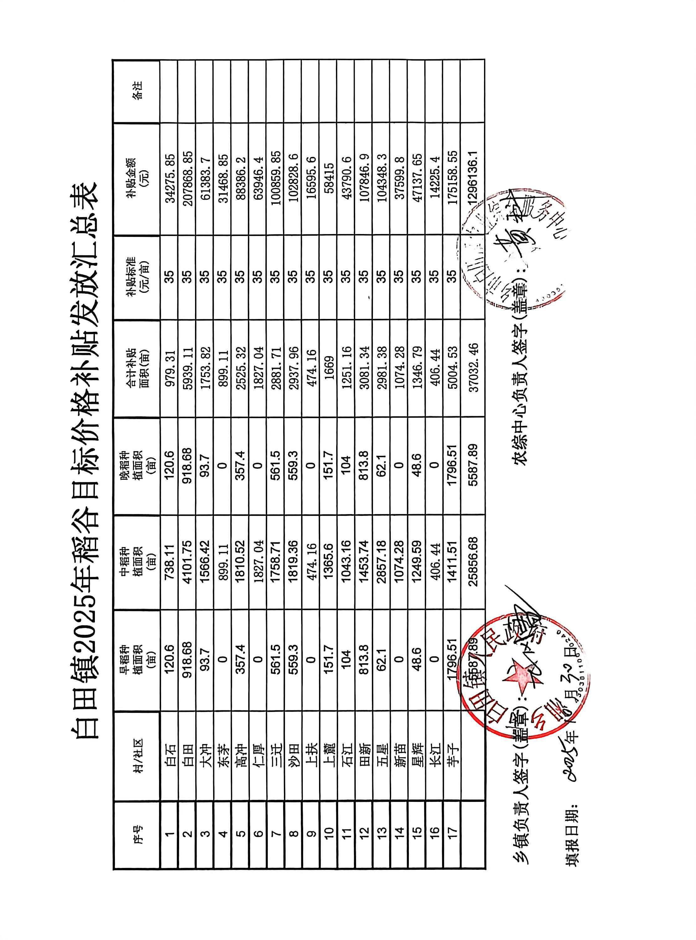 白田鎮2025年稻谷目標價格補貼發放匯總表