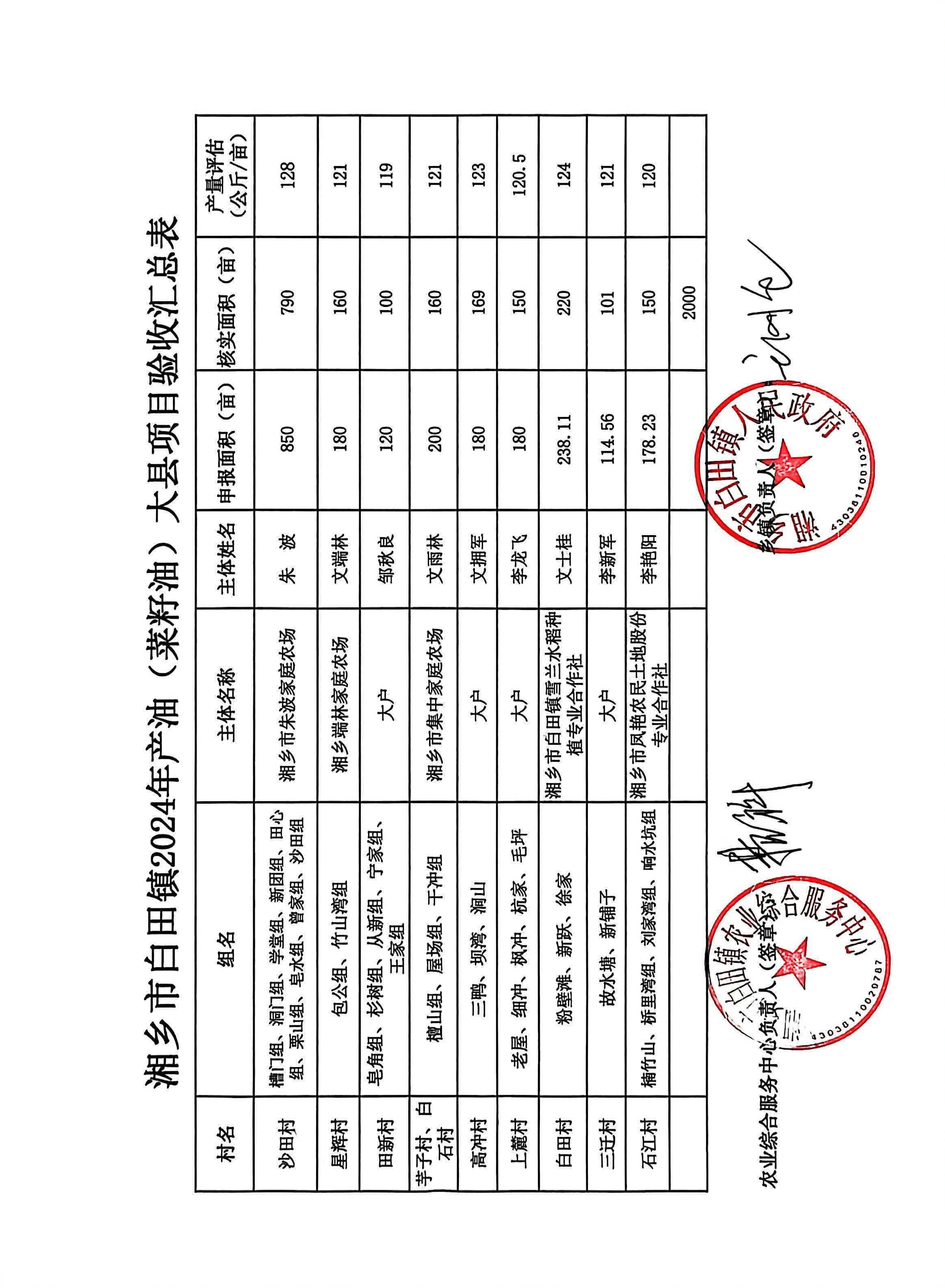 湘鄉(xiāng)市白田鎮(zhèn)2024年產(chǎn)油(菜籽油)大縣項(xiàng)目驗(yàn)收匯總表