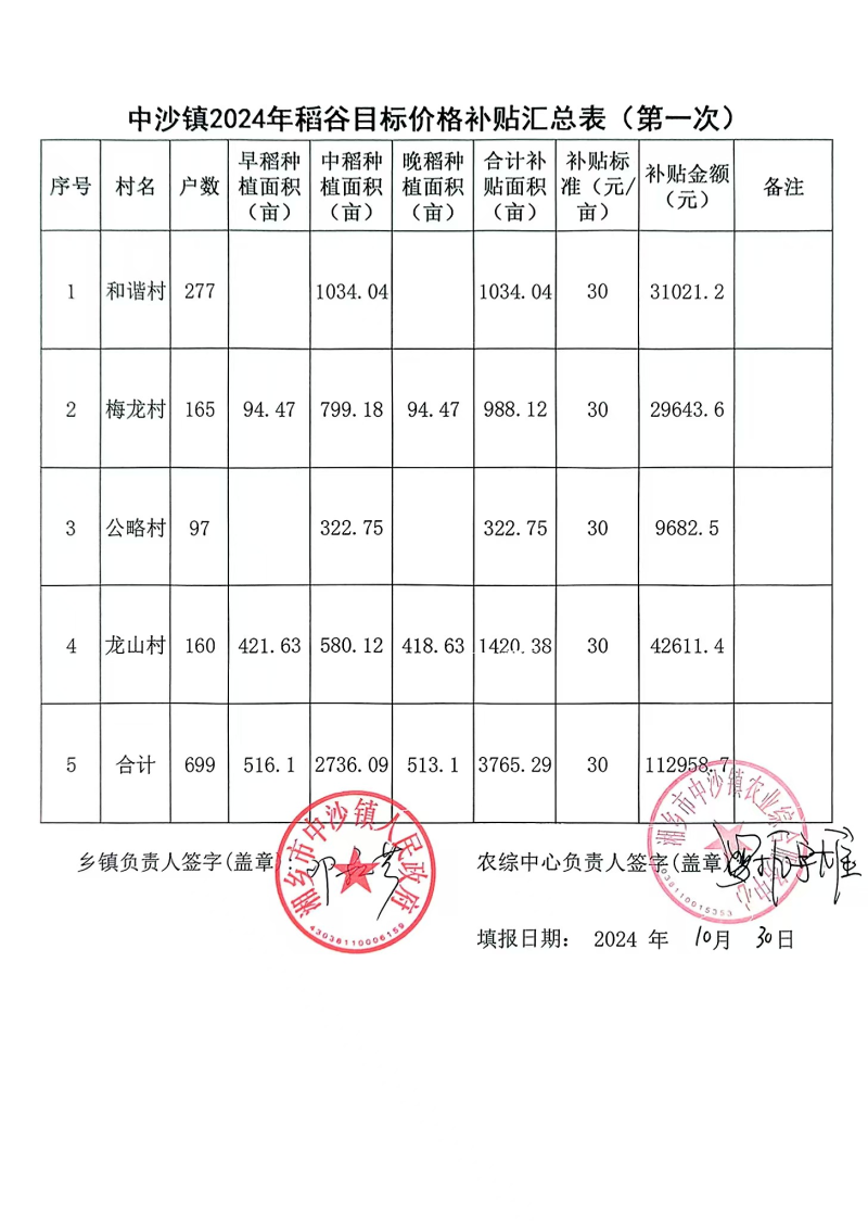 中沙鎮2024年稻谷目標價格補貼匯總表(第一次)