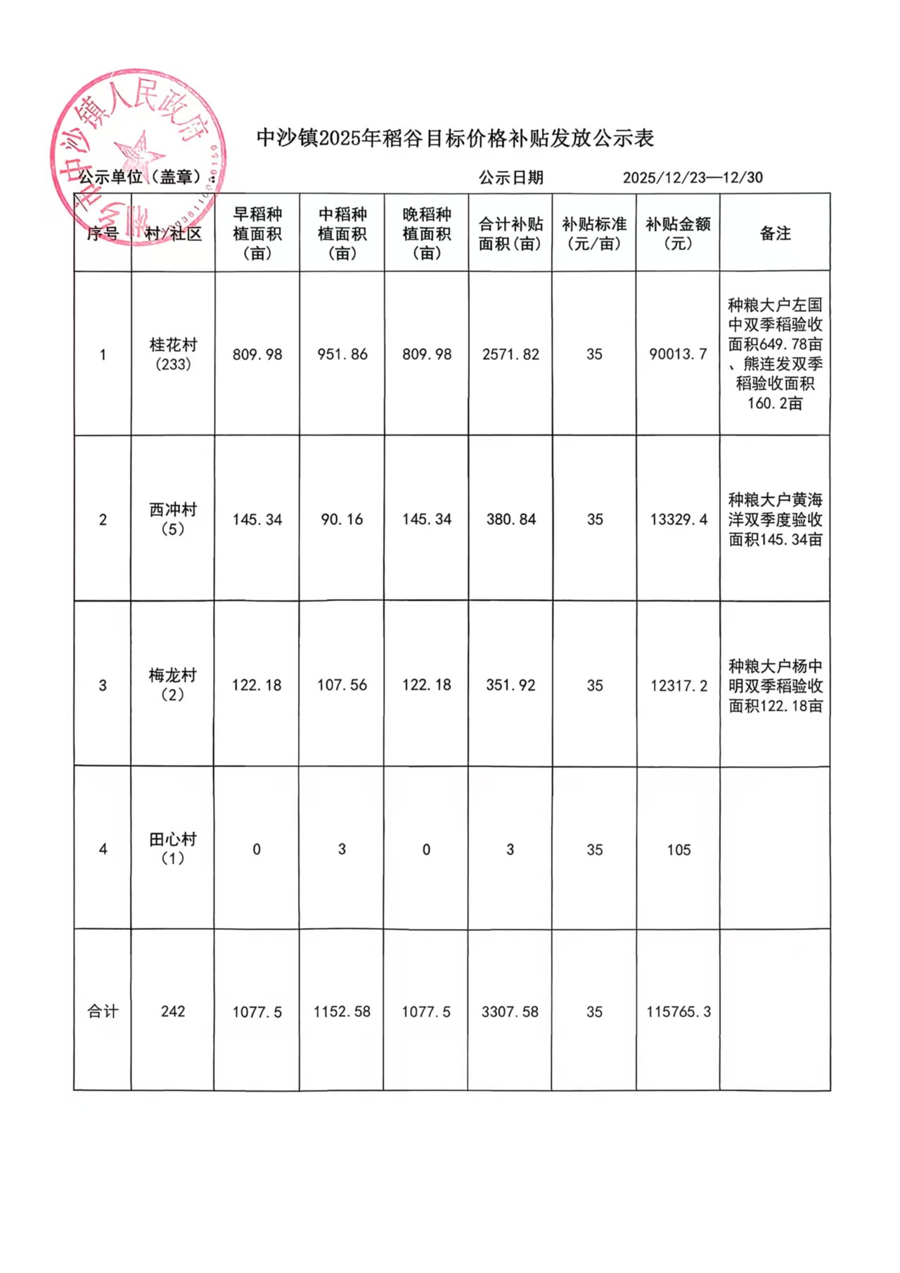 中沙鎮2025年稻谷目標價格補貼發放公示表