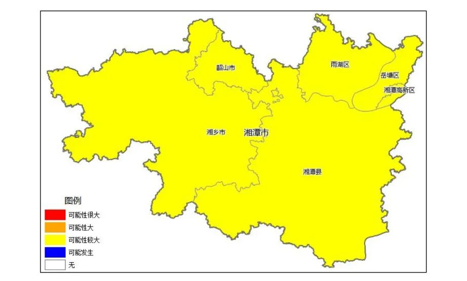 黃色預警區域:雨湖區、岳塘區、湘潭縣、韶山市、湘鄉市。