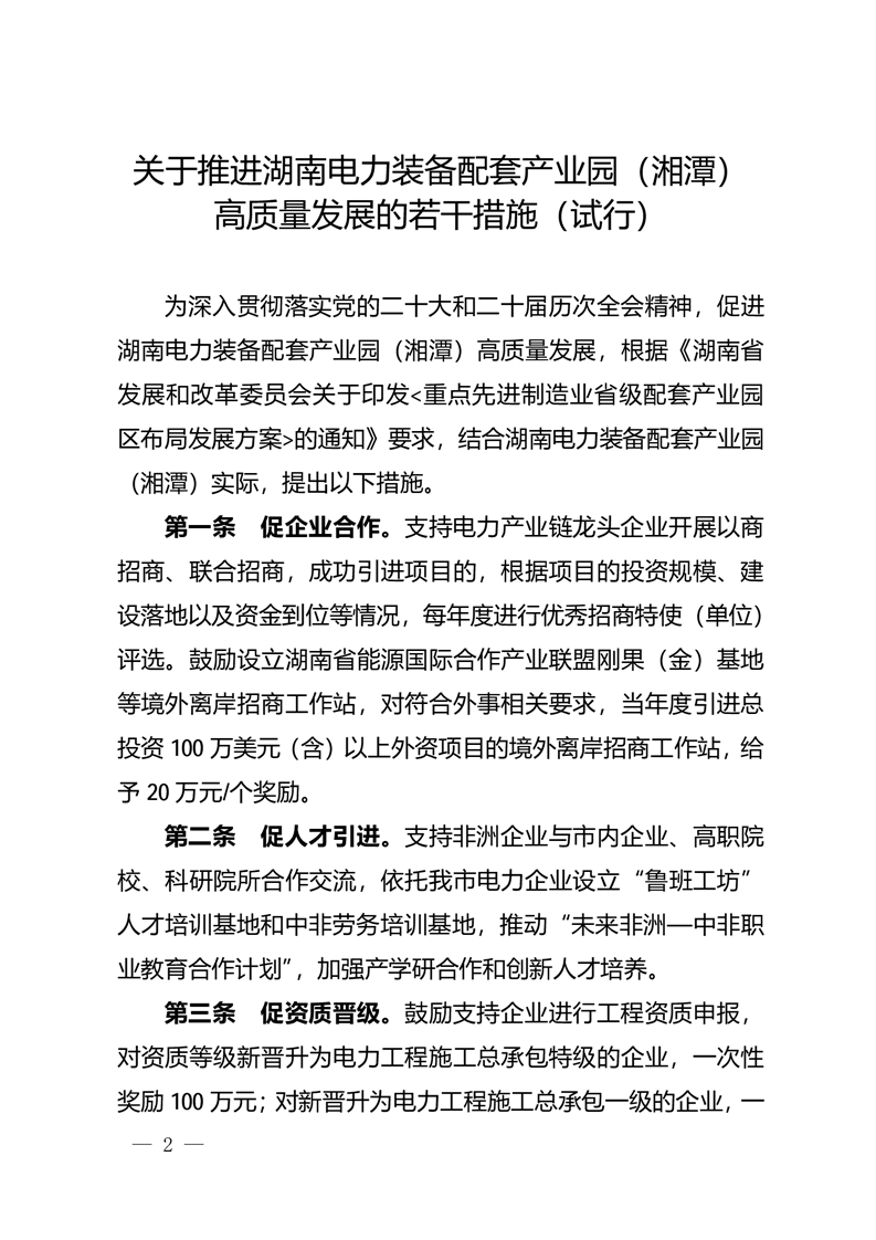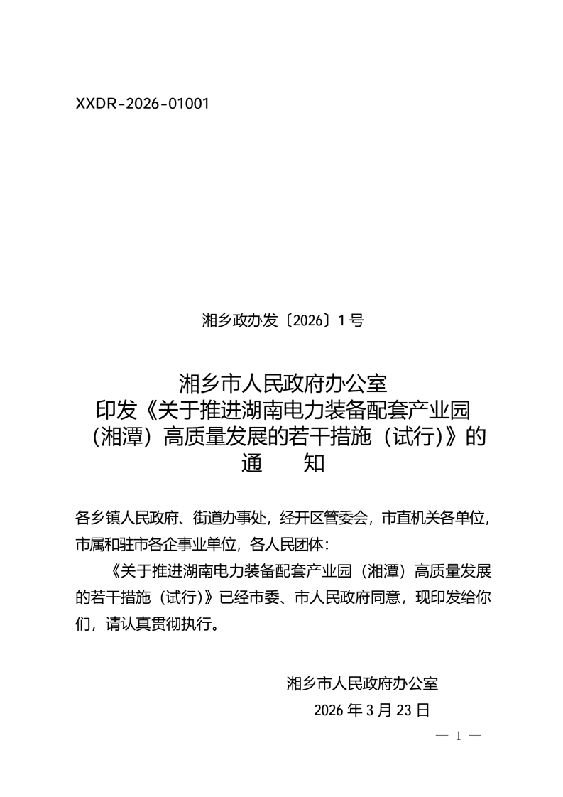 湘鄉市人民政府辦公室 印發《關于推進湖南電力裝備配套產業園 (湘潭)高質量發展的若干措施(試行)》的通知